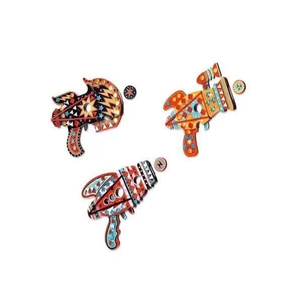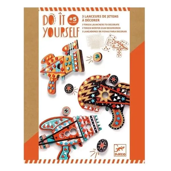 Un kit créatif complet avec trois modèles de lance-jetons à décorer à l'aide de stickers mosaïques.