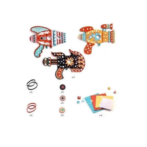 Contient : 3 lance-jetons en carton solide, 15 jetons, 6 élastiques, 4 planches de stickers mosaïques métallisés en mousse, 1 notice explicative.