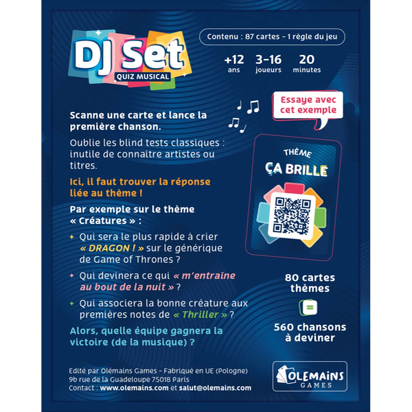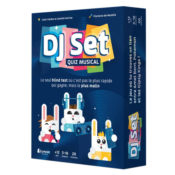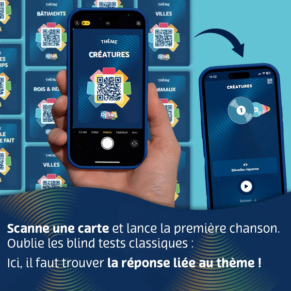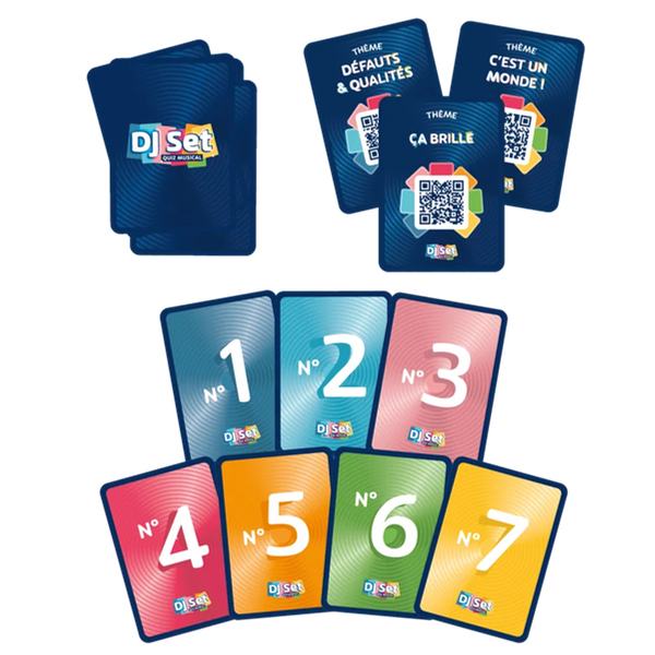 Dans DJ Set, les joueurs scannent un QR code qui renvoie vers une playlist thématique (par exemple Couleurs). En équipe, les joueurs trouvent la couleur évoquée par la musique, que ce soit dans les paroles (Paradis Blanc), le titre (Blue), le groupe (P!nk), ou le thème de la musique (les Simpsons).