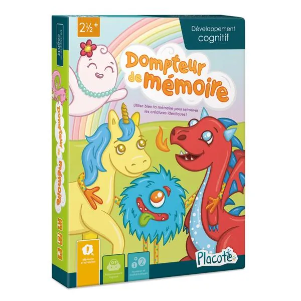 Dompteur de mémoire est conçu pour aider les enfants de 2½ ans à 7 ans à utiliser des stratégies de mémorisation qui les amènent à mieux se rappeler l’information. Il peut servir de premier jeu de mémoire pour les plus petits, car il permet de les initier à ce type de jeu avec des défis faciles. Il expose aussi les plus vieux à des défis difficiles grâce à l’augmentation progressive du nombre de cartes utilisées.