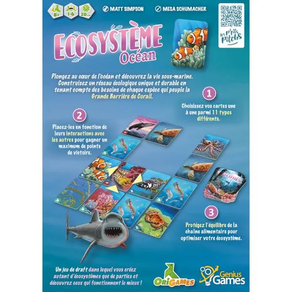 Choisissez et placez vos cartes une à une (parmi 11 espèces différentes) pour constituer votre écosystème. Chaque type de carte vous fait gagner des points de victoire en fonction de son interaction avec les autres. Les espèces sont classées en 3 catégories : Prédateurs, Proies ou Producteurs. Respectez l’équilibre de cette chaîne alimentaire pour maximiser votre bonus de points.
