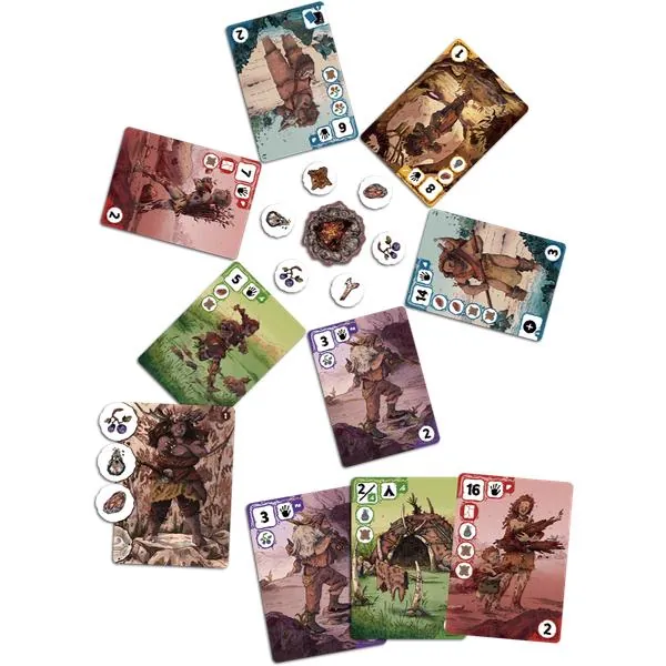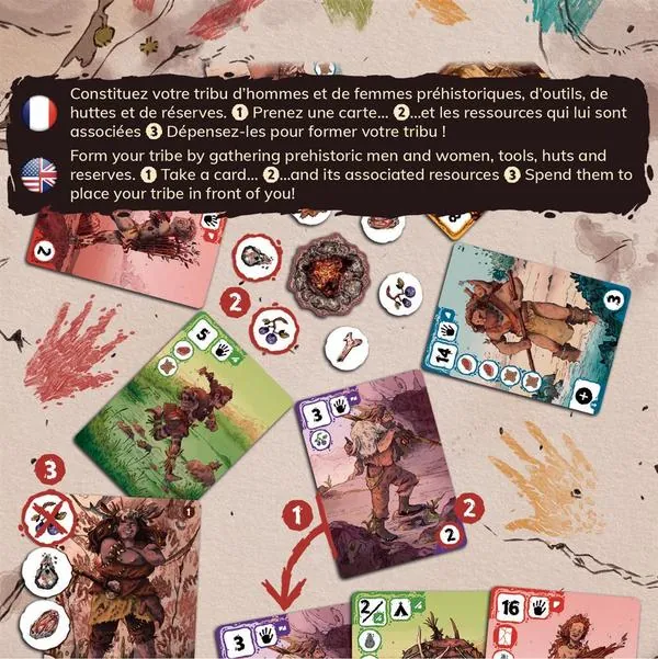 Formez votre tribu en rassemblant devant vous des cartes hommes et femmes préhistoriques, outils, huttes et réserves. Choisissez bien vos cartes ! Quand vous les prenez, elles vous donnent accès à des ressources indispensables au développement de votre tribu. En fin de partie, si elles s’associent bien, elles vous rapporteront de nombreux points.