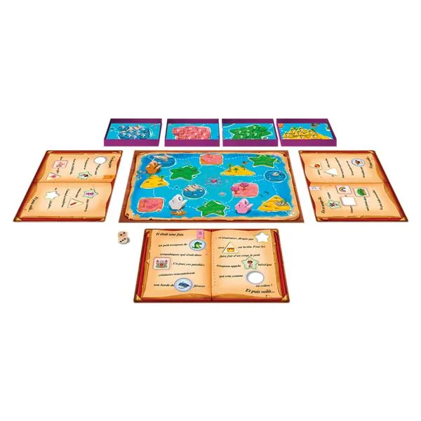 Leur plateau de jeu comporte une histoire avec des trous de formes différentes. Déplacez votre bateau d’île en île avec votre dé. La forme de l’île atteinte vous indique quelle forme de jeton piocher. Bouchez un trou de la même forme avec votre jeton et complétez votre histoire !
