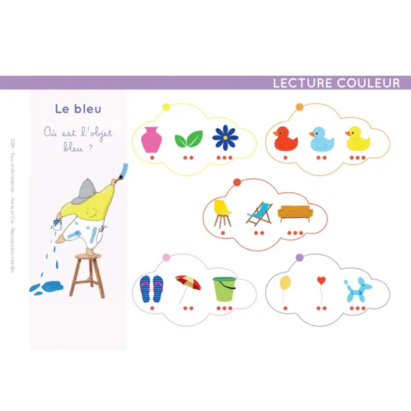 La mise en page est adaptée aux plus petits, avec sur la page supérieure 5 questions de couleur, et sur la partie inférieure 5 autres questions.