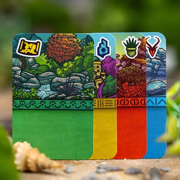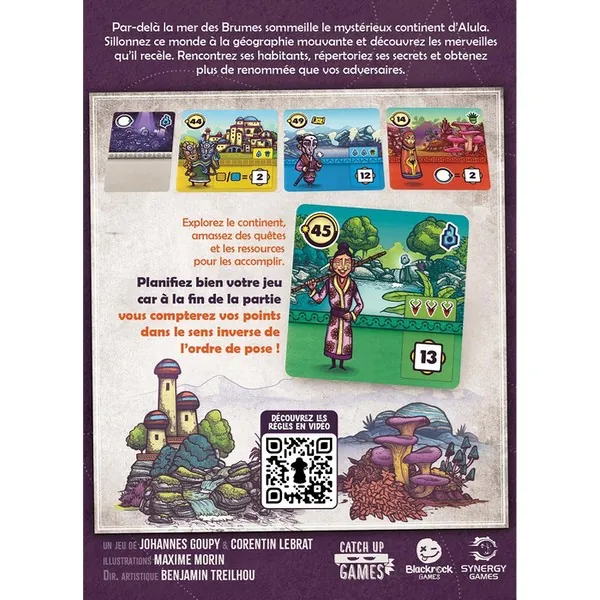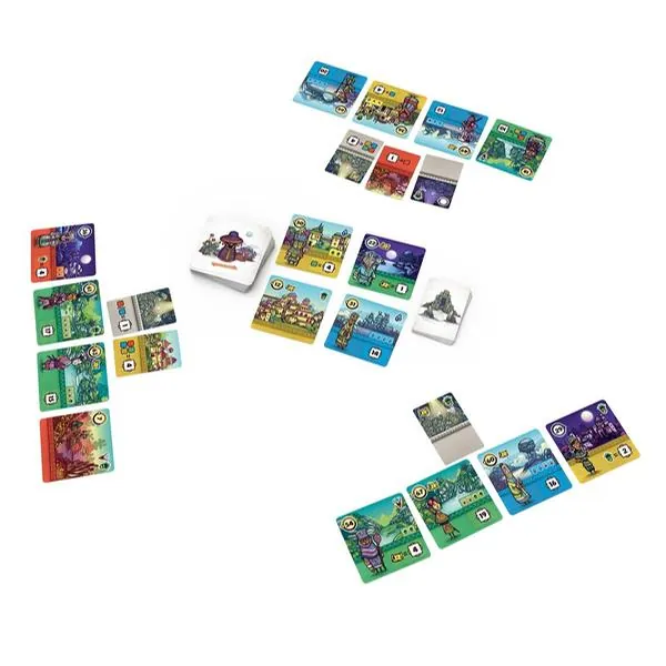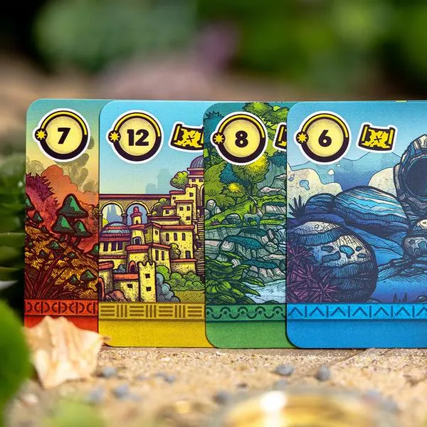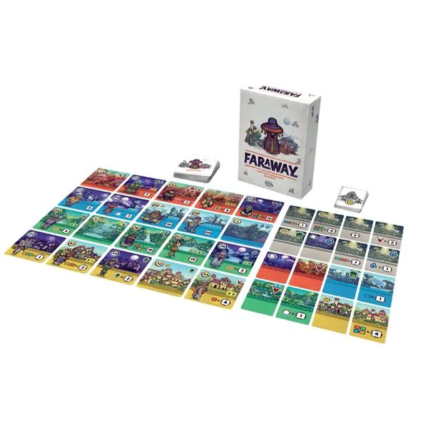 Dans une partie de Faraway, vous jouez 8 cartes devant vous, en une ligne de gauche à droite. Ces cartes représentent les régions que vous visitez lors de votre exploration. Chaque carte vous demande de remplir des conditions pour gagner des points de victoire. En fin de partie, vous réalisez le chemin de retour en comptant vos points dans le sens inverse de pose. Et c'est là tout le sel du jeu. Tout au long de la partie, vos cartes serviront à la fois à vous fixer de nouveaux objectifs et à remplir ceux que vous avez déjà joués. À chaque tour, vous faites votre choix dans votre main de 3. Puis vous complétez votre main grâce à la rivière de cartes. Faraway se jouant en simultané, un astucieux système de priorité accentue encore l'importance de vos décisions. Car choisir en dernier vous laisse moins d'option, réduisant vos possibilités lors des tours suivants.
