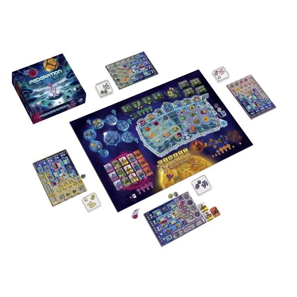 Federation est un jeu de pose d’ouvriers complètement fou. Chacun de vos pions ambassadeur est double face finance/vote et se place dans le bâtiment du sénat. Mais sur quelle face et où ? Aile droite ? Étage ? Colonne ? Dix-huit actions sont à portée de chaque ambassadeur et chacune à plusieurs niveaux.