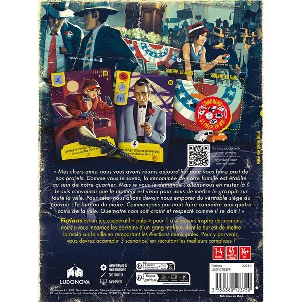 Fictions est un jeu coopératif « pulp » pour 1 à 4 joueurs inspiré des romans noirs : vous incarnez les parrains d’un gang mafieux dont le but est de mettre la main sur la ville en remportant les élections municipales.