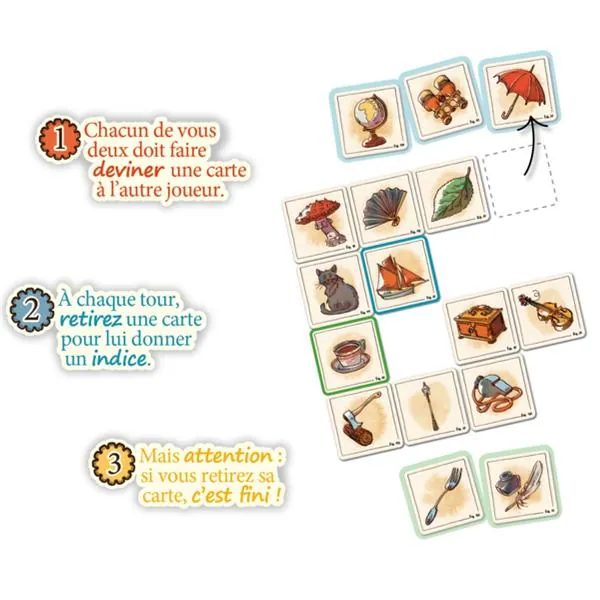 - A tour de rôle, sélectionnez avec finesse une carte afin de donner un indice