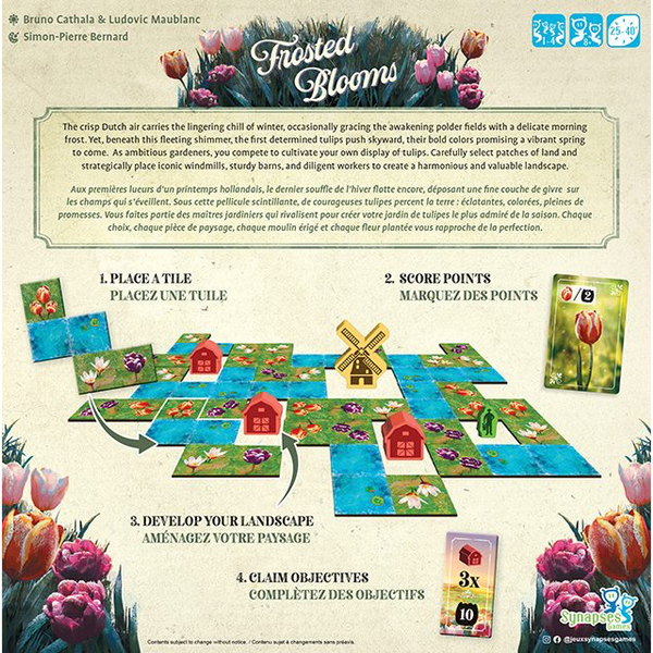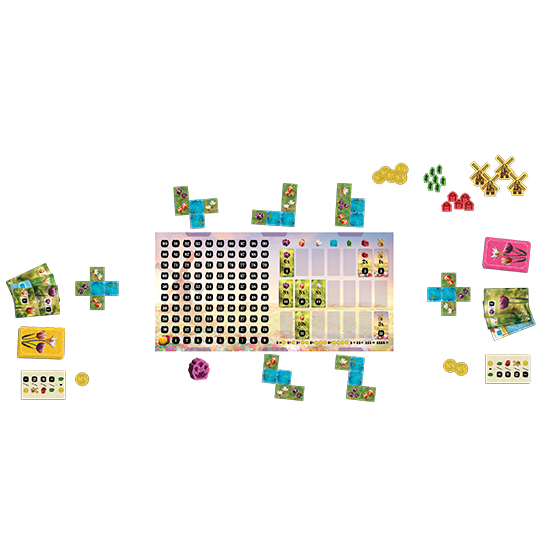 À chaque tour, ils sélectionnent une tuile Paysage pour l’ajouter à leur propre jardin, puis jouent une carte de leur main afin de marquer des points selon les groupes de motifs obtenus. Les espaces clos accueillent des Ouvriers, Granges ou Moulins qui offrent d’importants bonus de fin de partie. De plus, en regroupant certains éléments et en remplissant leur jardin, les joueurs peuvent valider des objectifs. Celui ou celle qui termine avec le score le plus élevé remporte la partie !