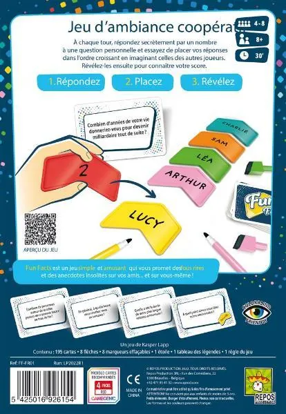 Fun Facts est le nouveau jeu d'ambiance coopératif de Repos Production ! Après Just One et So Clover, voici un nouveau party game rapide et bienveillant, idéal pour l'apéro ! Vous allez vous découvrir les uns les autres, en répondant à des questions qui partent dans tous les sens.