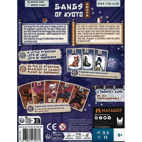 La vie d’un chat peut très bien être formiaoudable, mais même le plus heureux des chats sera curieux de savoir ce qui se cache derrière les murs de son jardin ! Dans ce jeu, les joueurs incarnent les chats qui explorent la ville. Au fur et à mesure que la pioche est explorée, les chats découvriront de la nourriture, des amis et des cadeaux spéciaux... Mais attention à ne pas rester trop tard : vous pourriez bien vous perdre dans les rues de Kyoto !