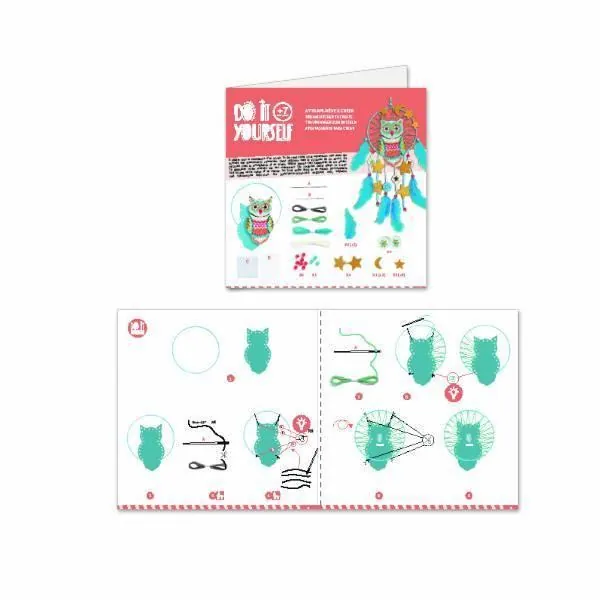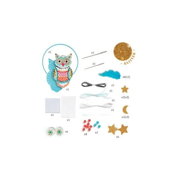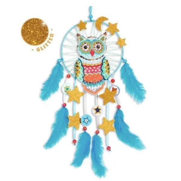 Pas à pas, votre enfant va réaliser un superbe attrape-rêve orné d'une chouette qui décorera sa chambre et le protégera des mauvais rêves. Pour faciliter la création de l'attrape-rêve, le cercle est livré enrubanné et une aiguille à broder est fournie pour l'étape de tissage.