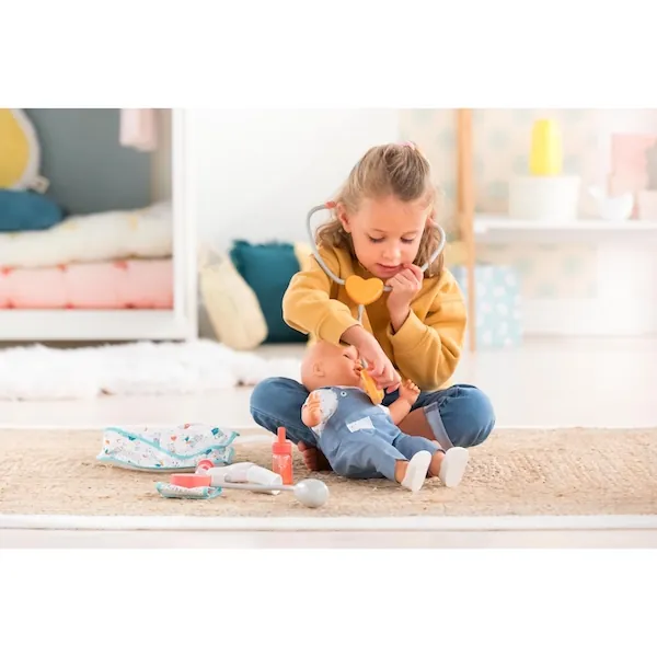 Contient: 1 stéthoscope qui simule les battements du cœur, 1 seringue rétractable, 1 flacon de vitamines, 1 tensiomètre, 1 plâtre de bras pour les gros bobos, 1 thermomètre et 1 mallette tissu pour tout ranger.