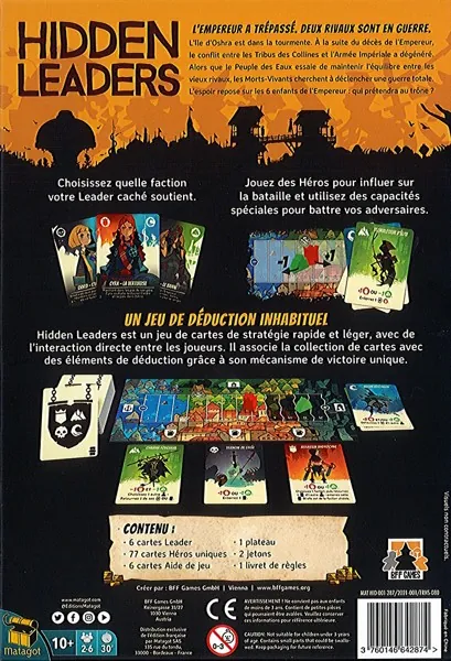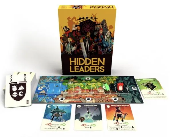 Hidden Leaders est un jeu de cartes de stratégie rapide et léger avec une interaction directe entre les joueurs. Il combine la construction de tableaux et des éléments de déduction avec son mécanisme de victoire unique. C'est un jeu de grande tension, sans temps mort, qui s'apprend rapidement. Son graphisme distinctif et les noms des personnages vous feront sourire.