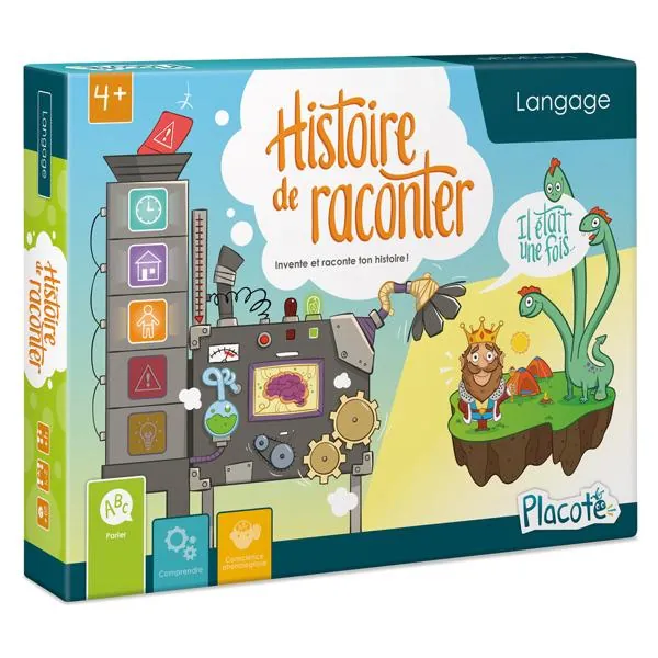 Histoire de raconter est conçu pour aider les enfants de 4 à 9 ans à développer leur habileté à raconter une histoire à l’oral. Ils doivent inventer un récit qu’ils composent à partir de cartes qu’ils récoltent en alternance avec les autres joueurs. Les cartes représentent les éléments de base du récit et sont placées sur une planche de jeu, ce qui permet aux enfants de visualiser leur histoire au fur et à mesure qu’elle se forme et de la raconter en y intégrant tous les éléments.