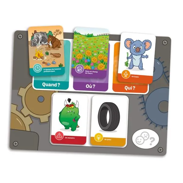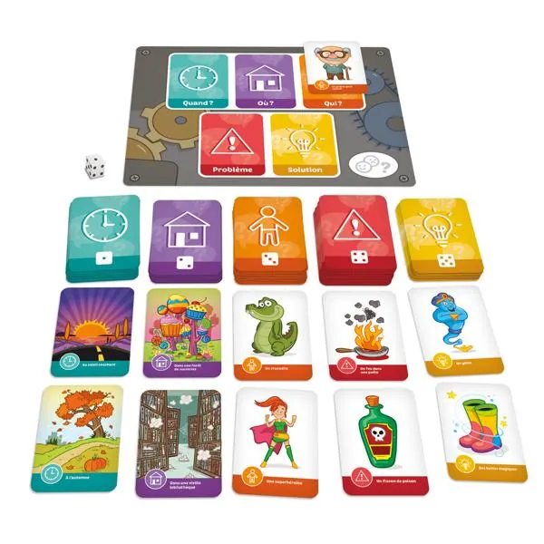 Fais appel à ton imagination pour créer l’histoire la plus amusante! Récolte des cartes qui correspondent au personnage, au lieu, au temps, au problème et à la solution de ton histoire. Raconte-la ensuite aux autres joueurs!