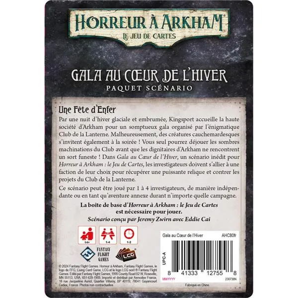 Gala au Cœur de l’Hiver est un scénario inédit pour Horreur à Arkham : le Jeu de Cartes, une expérience palpitante et pleine d’interaction pour 1 à 4 joueurs !