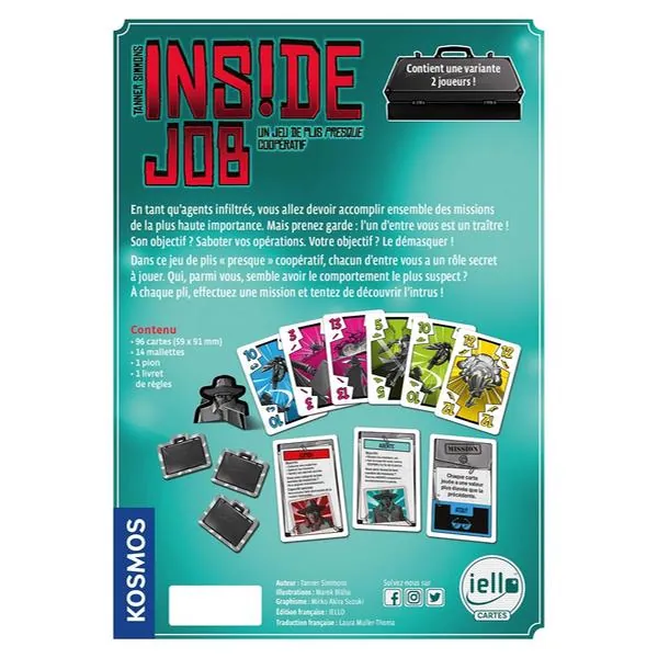 Inside Job est un jeu de plis à très haute tension, dans lequel les joueurs doivent réussir le pli demandé par la carte mission. Chaque carte mission, en effet, indique la manière dont elle doit être résolue et quel est l’atout de la manche en cours.
