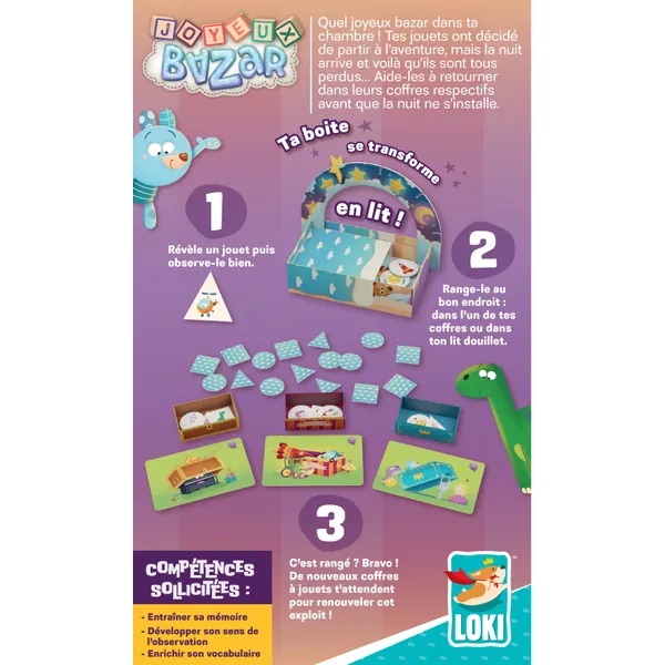Pour cela, révèle un jeton jouet et observe-le attentivement. Range-le dans le coffre correspondant ou place-le dans ton lit douillet s’il n’apparaît sur aucune illustration de coffre. Attention à ne pas révéler trop d’étoiles, car elles te rapprochent de la tombée de la nuit et de la fin de la partie.