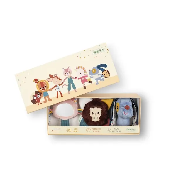 Présentés dans leur joli coffret illustré, ces jouets d’éveil sensoriel stimulent 3 sens : la vue, le toucher et l’ouïe.