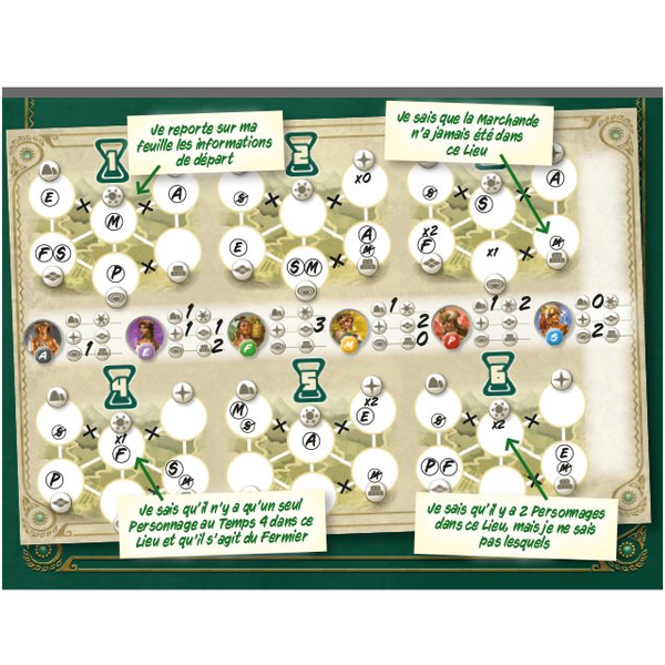 Récupérez des indices en utilisant les plaques Temps et Personnage pour comprendre les déplacements des suspects de l’intrigue dans les différents Lieux. Attention, certaines routes peuvent être à sens unique ou barrées en fonction des enquêtes. Vous recevez une information privée, ainsi qu’une seconde que vous devez partager avec les autres. Prenez des notes sur votre feuille et déduisez les réponses à l’enquête en cours.