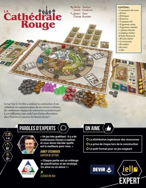 La Cathédrale Rouge est un jeu de stratégie qui associe opportunisme et optimisation au moyen d’une mécanique particulièrement originale de gestion des ressources.