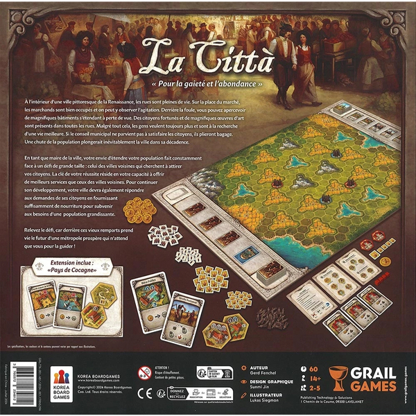 Ce jeu, une réimplémentation de l'original La Città, contient une nouvelle extension (Pays de Cocagne) qui comprend de nouveaux bâtiments, de nouvelles cartes politiques et de nouvelles tuiles de terrain.