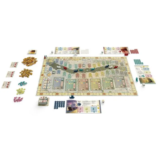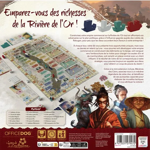 Dans La Rivière de l’Or, vous devrez élaborer la meilleure stratégie pour accumuler le plus de points de victoire en construisant votre empire commercial, navigant sur la rivière et développant votre influence auprès des nobles de la Région. À chaque tour, votre dé vous présente trois opportunités uniques, mais vous ne devrez en retenir qu’une : vous pourrez soit développer votre empire commercial en construisant des bâtiments sur la berge, soit naviguer vers l’embouchure de la rivière pour charger vos soutes d’or et de marchandises, soit remplir un juteux contrat avec un client influent.