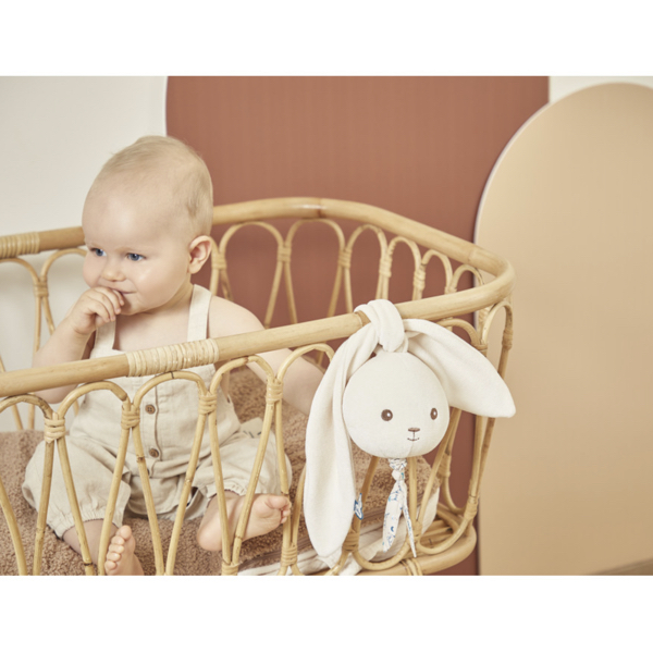 Pour apaiser bébé, l’accompagner vers le sommeil ou le divertir à tout instant, ce jouet musical nomade s’accroche facilement en nouant ses oreilles.