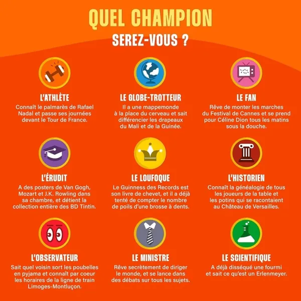 Neuf catégories, neuf médailles réparties entre les différentes équipes (2 à 4), neuf catégories de questions :