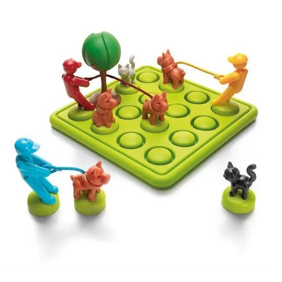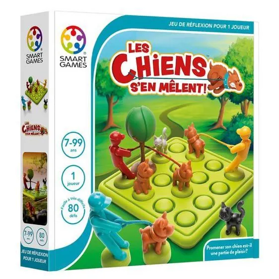 Découvrez le jeu Les chiens s'en mêlent de Smartgames, un jeu de logique où vous devrez réaliser 80 défis évolutifs à partir de 7 ans. Soyez le meilleur maître possible, en évitant les aboiements et les miaulements! Le but du jeu est de compléter le plan de jeu en évitant que les chiens ne s'emmêlent.