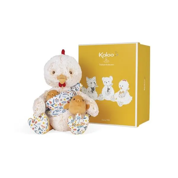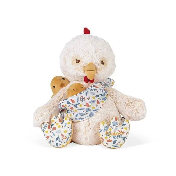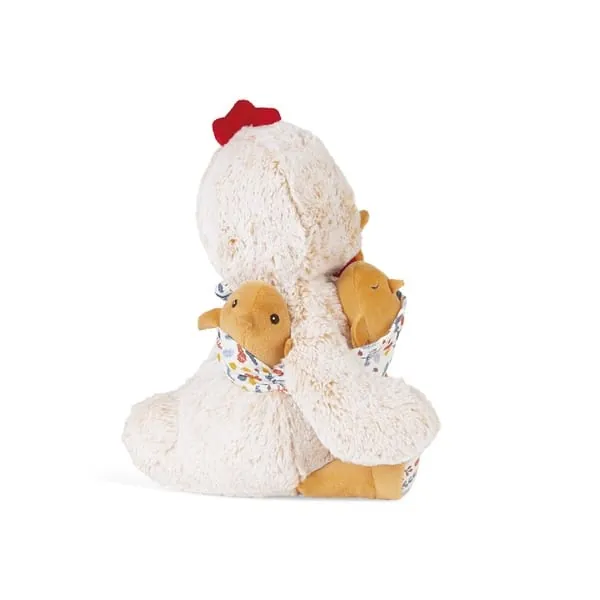 Papa Poule Paul est une peluche avec une fourrure bicolore couleur crème infiniment douce. Cet animal en peluche tient tendrement ses 2 poussins dans un porte-bébé en mousseline de coton avec un joli imprimé "sous-bois".