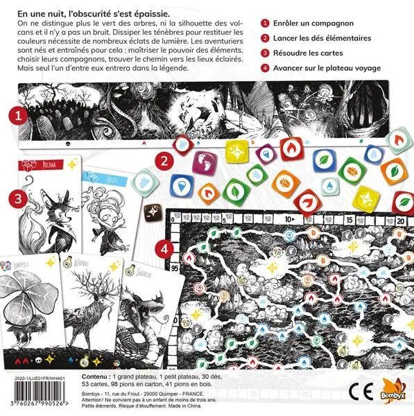Lueur se déroule au fil des huit journées qui composent la partie, enrôlez huit compagnons pour constituer peu à peu votre compagnie. Leurs effets, liés aux éléments et activés selon le résultat de vos dés, vous apporteront la majorité des éclats de lumière. Avancez ensuite à la recherche de villages éclairés. Celui qui récoltera le plus d’éclats de lumière dissipera les ténèbres et inscrira son nom dans les textes anciens.