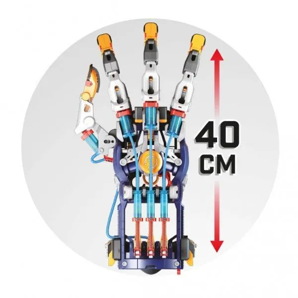 Construis une main cyborg articulée en assemblant les pièces. Ajoute de l'eau dans le système et pilote-la du bout des doigts.
