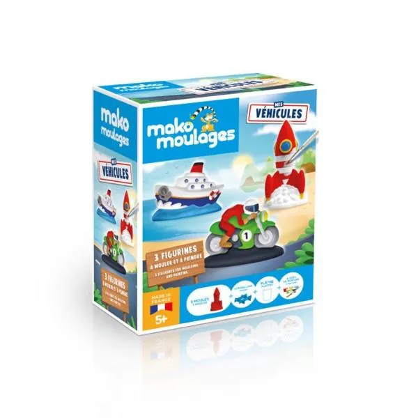 Mako moulages c’est un coffret complet pour réaliser 3 créations sur le thème des véhicules, grâce aux formes simples qui permettent un démoulage facile. Les petits-makomouleurs vont adorer mouler, démouler et personnaliser les créations !