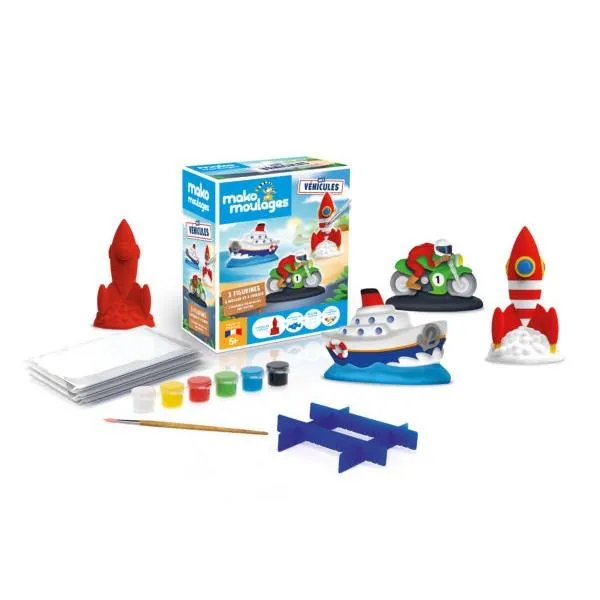 Contient : 3 moules en latex : 1 bateau, 1 moto, 1 fusée, 3 sachets prédosés de plâtre, 4 croisillons, 6 x 5 ml de peinture : jaune, rouge, vert, blanc, noir, bleu, 1 notice.