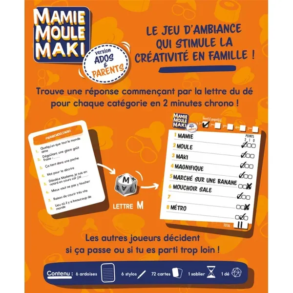 Mamie Moule Maki version Ados & Parents est un jeu simple, accessible, et idéal pour animer une soirée en famille. Il favorise l’échange, la créativité, et l'humour, sans jamais devenir trop complexe.
