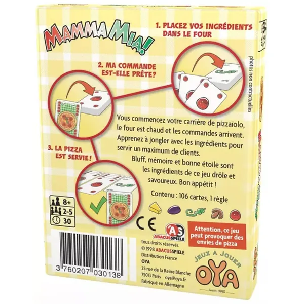 - 106 cartes (40 commandes + 65 ingrédients + 1 carte "Mamma Mia!")