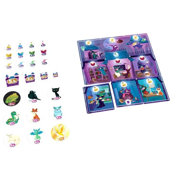 - 24 jetons Objet magique : x2 Potions vertes, roses, jaunes et bleues / x2 Baguettes vertes, roses, jaunes et bleues / x2 Livres verts, rose , jaunes et bleus