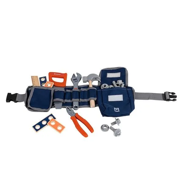 21 accessoires inclus : 1 ceinture de mécanicien, 1 pince plastique, 1 clé plastique, 1 marteau, 1 scie plastique, 1 règle, 2 planches 3 trous, 2 planches 2 trous, 3 petites vis, 3 grandes vis et 6 écrous.