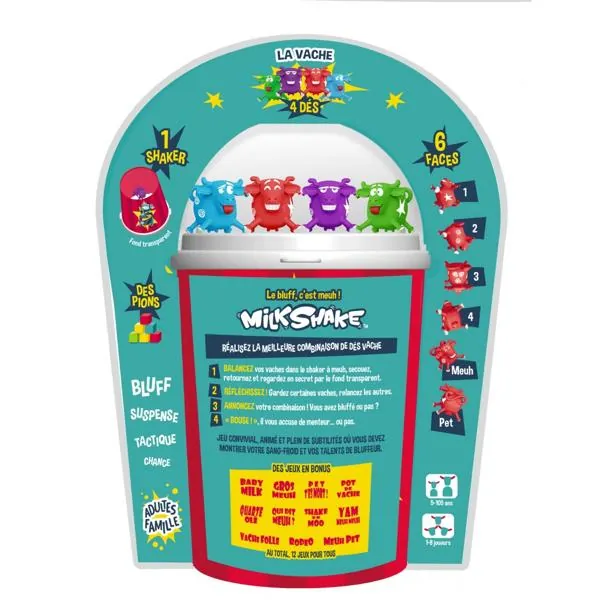 Au total, 12 règles de jeux pour tous en bonus : Qui dit meuh, Pet t’es mort, Pot de Vache,etc ... Tous les styles sont proposés (bluff, risque, chance) pour des publics différents, adultes ou famille.