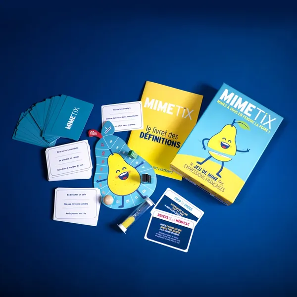 Le principe est simple : en moins d'une minute, mimez et faites deviner le maximum d'expressions françaises à vos coéquipiers. Le plus drôle en plus des mimes ? Les réponses fabuleuses des joueurs qui s'arrachent les cheveux et s'emmêlent les pinceaux pour restituer l'expression exacte. Retrouvez un plateau double face pour des parties avec des règles adaptées à 2 ou 3 équipes : - partie à 2 équipes : vous mimez le plus d'expressions possible à vos coéquipiers en moins d'une minute et avancez selon le nombre d'expressions trouvées - partie à 3 équipes : vous mimez le plus d'expressions possible à vos adversaires en moins d'une minute (le mime et l'équipe qui trouve avancent sur le plateau)