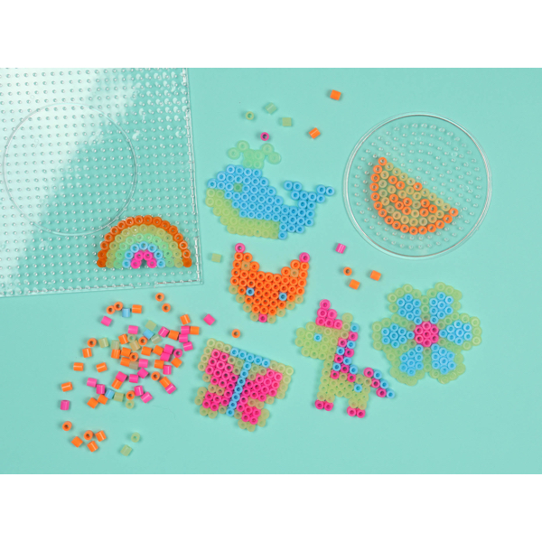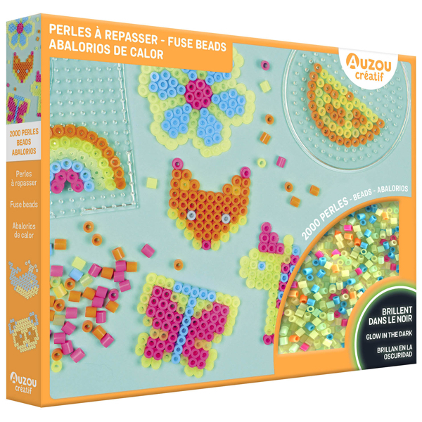 Contient : 2000 perles dont 500 qui brillent dans le noir, 16 modèles, 2 plaques, 1 pince, et 3 attaches porte-clés pour y accrocher les créations !