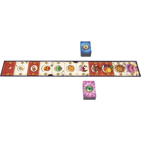 Un joueur contrôle les poilus tandis que le second contrôle les écailleux. Un plateau banquet de pâtisserie est placé entre les joueurs. À votre tour, regardez la première tuile de votre pioche de monstres et placez-là, face cachée, sous l’un des desserts. L’adversaire n’a personne en face ? Vous contrôlez ce délice, sinon, il y a bataille ! Votre opposant révèle sa tuile, pas vous, si votre monstre a une valeur égale ou plus élevée, dites-lui et sa tuile est défaussée. Sinon, c’est vous qui enlevez votre tuile, tout en laissant celle de l’adversaire visible. Attention, si vous tombez sur le piège de l’adversaire, vous perdez automatiquement !