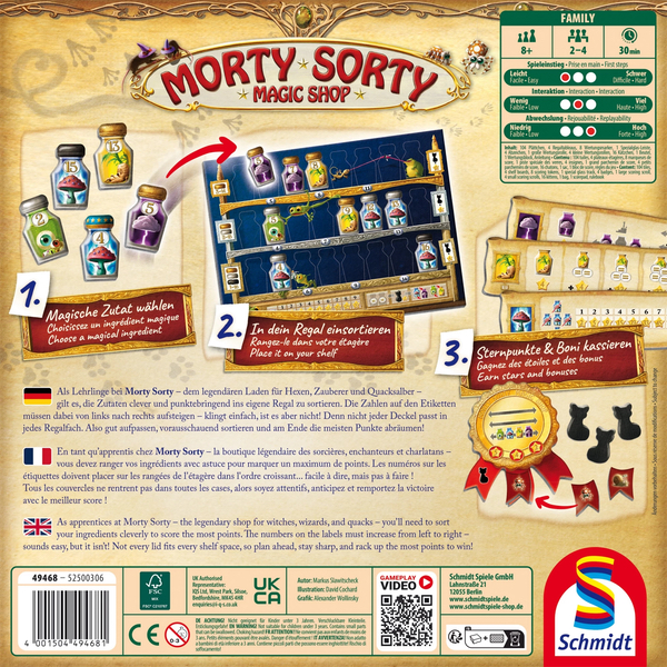 En tant qu’apprentis chez Morty Sorty, la boutique légendaire des sorcières, enchanteurs et charlatans, vous devez ranger vos ingrédients avec astuce pour marquer un maximum de points. Les numéros sur les étiquettes doivent être placés sur les rangées de l’étagère dans l’ordre croissant… facile à dire, mais pas à faire !