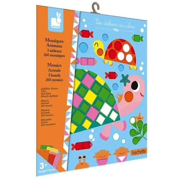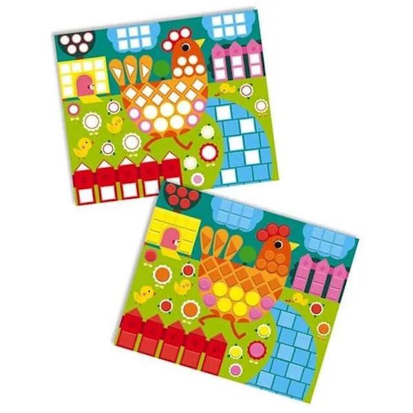 Un coffret contenant 3 tableaux à décorer (une poule, un éléphant et une tortue) avec 260 gommettes de mosaïques en mousse autocollantes (6 couleurs différentes) et 3 attaches.
