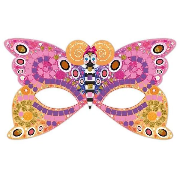 Contient : 6 masques à décorer, 5 planches de mosaïque (violet, rose, bleu, argent, doré), 6 attaches élastique.