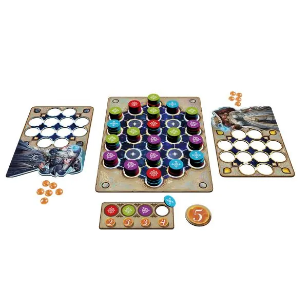 Les joueurs vont déplacer des piles de jetons sur le plateau central en utilisant leur énergie pour former des triangles de même couleur. Alors, ils pourront récupérer un jeton pour le placer astucieusement sur leur plateau Magicienne.