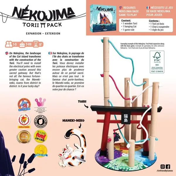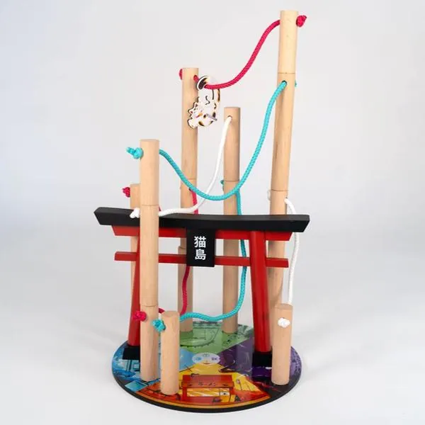 Le but reste le même : maintenir en équilibre l'installation des poteaux électriques. Désormais, avec encore plus de prudence autour du Torii, un véritable obstacle, et le Maneki Neko, un nouveau chat à suspendre et... à décrocher !