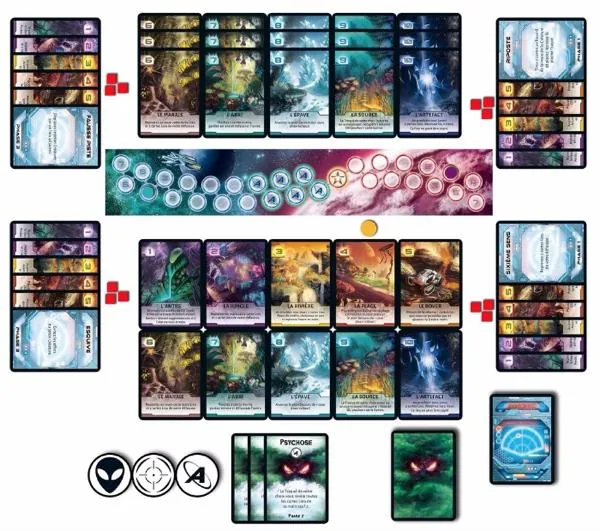 Si vous incarnez l’un des Traqués, vous explorerez Artemia au moyen de cartes Lieu. Aidés de vos cartes Survie, vous tenterez de résister à la traque de la Créature jusqu’à l’arrivée des secours.